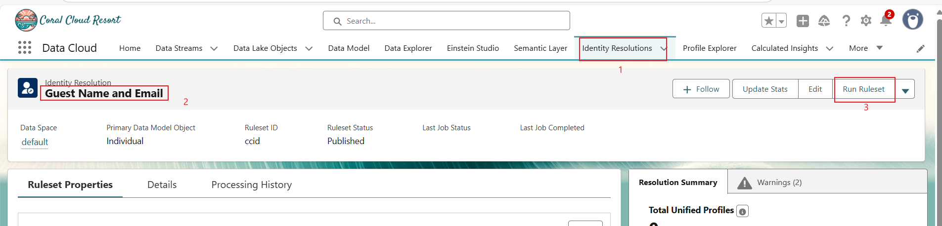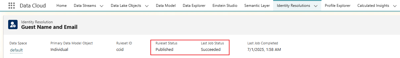 回到Identity Resolutions(身份解析),确认 Last Job Status(上次任务状态)字段显示 Success.