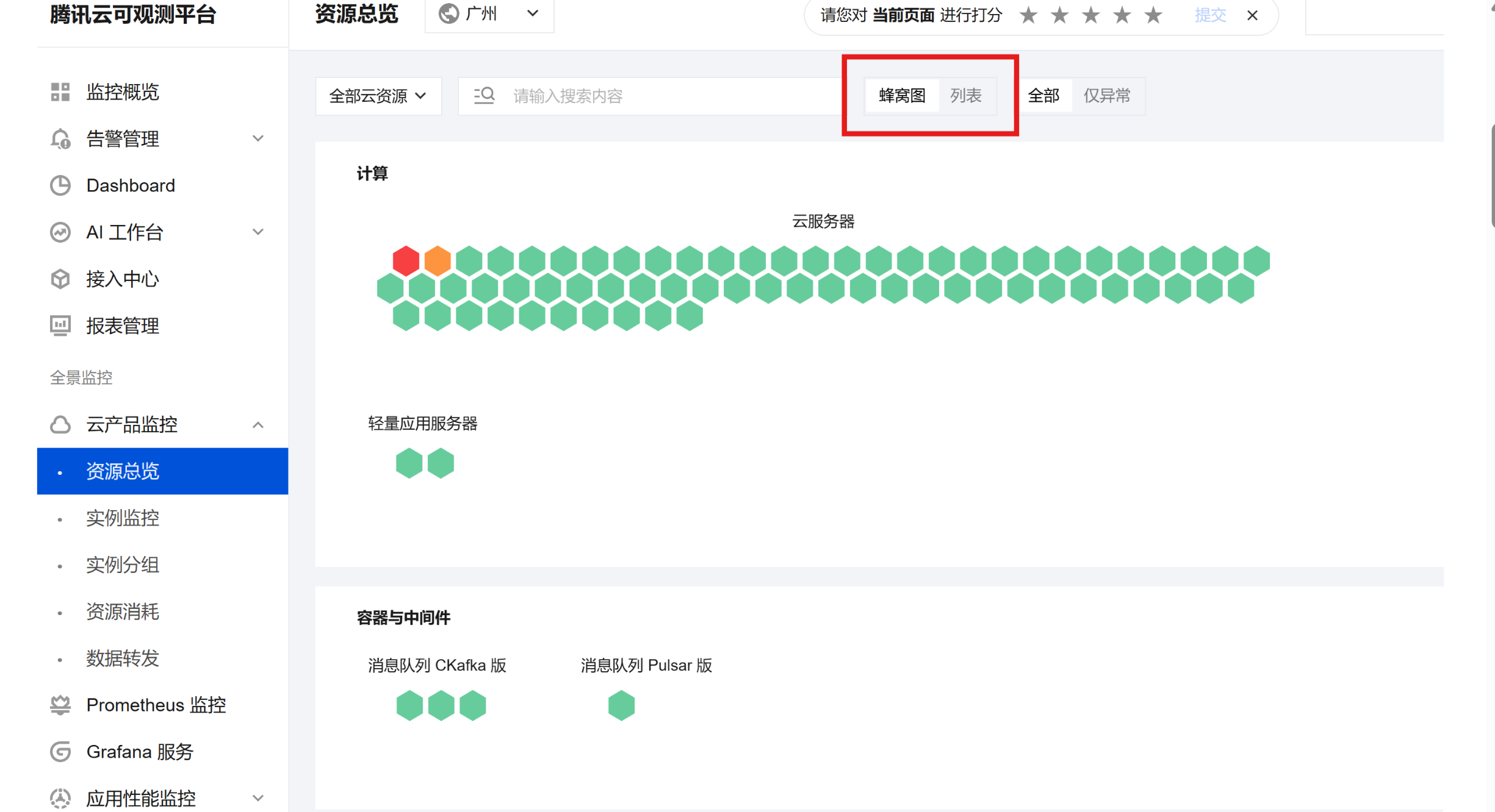蜂窝图:以可视化方式将计算、存储、网络等资源状态浓缩为直观色块,异常资源自动标红预警,快速锁定全局风险。