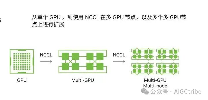 NCCL 库优化跨节点 GPU 通信,支持 all-gather、reduce-scatter 等操作。
