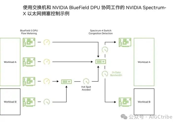 以太网 ECN(显式拥塞通知)在突发流量下易丢包,Spectrum-X 通过交换机遥测数据实时通知 DPU 调整速率。
