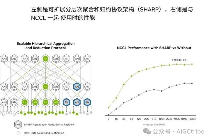 InfiniBand 的 SHARP 协议在交换机中硬件加速数据归约,例如在 400Gb/s 网络中,使用 SHARP 的 NCCL 性能比不使用时高1.7 倍。