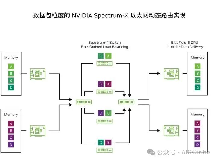 Spectrum-X 采用数据包粒度动态路由,结合 DPU 的直接数据放置(DDP)实现有序交付;InfiniBand 通过子网管理器动态均衡流量,提升链路利用率。