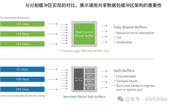 通用共享缓冲区(如 Spectrum-4 的 133Gbps 全共享缓冲区)比分割缓冲区有效容量大4 倍,公平分配带宽,避免 “嘈杂邻居” 影响。