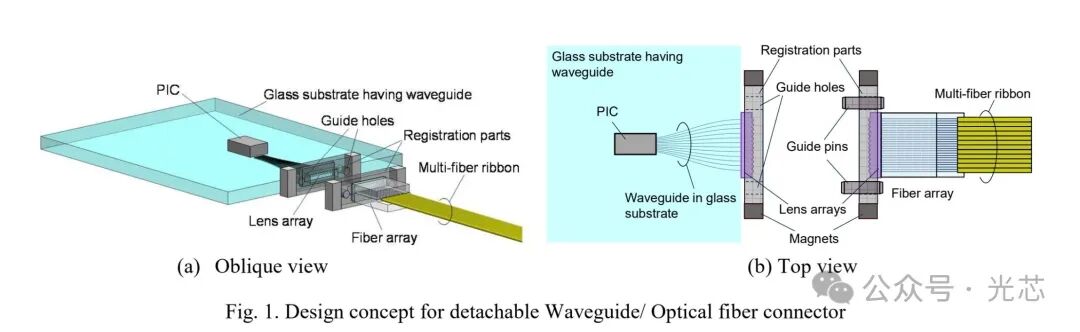 ① 结构特点:采用12通道、250μm间距接口,通过准直光束耦合和磁力连接实现。玻璃基板中的波导和光纤阵列(FA)通过类似MT连接器的定位部件连接。该定位部件由聚苯硫醚(PPS)制成,并通过注塑成型以实现高生产率。