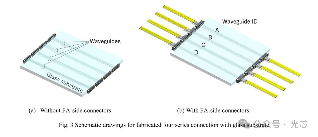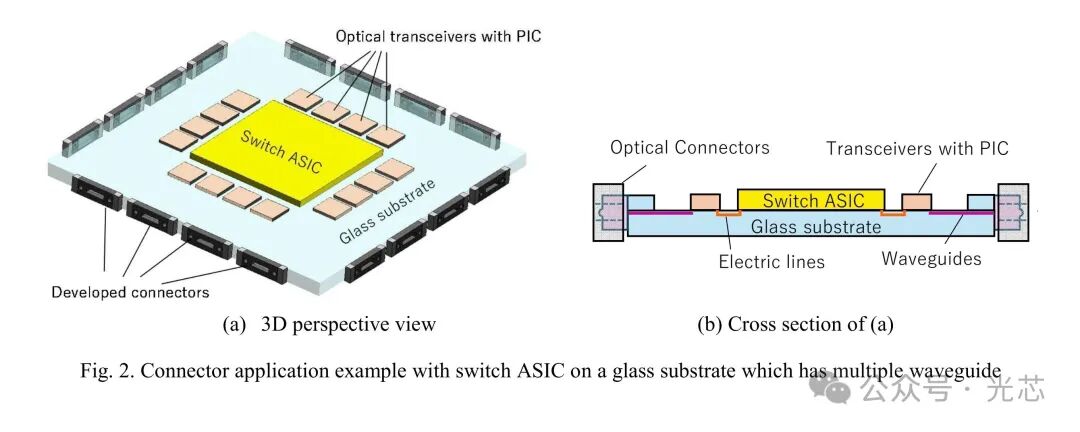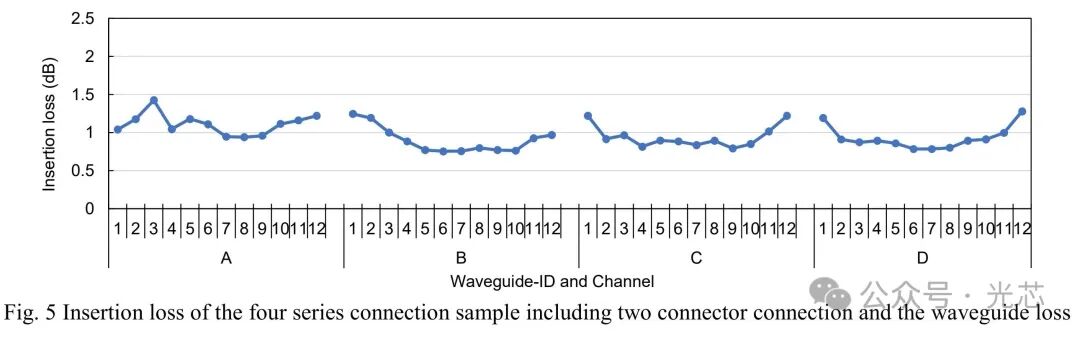 ① 高密度连接:实现四组12通道连接器在玻璃基板上的部署, shoreline密度达1.2ch/mm。玻璃基板的波导通过双光子直写加工,插入损耗为0.5-0.8dB。实测包含两个连接器和波导损耗的总插入损耗<1.5dB(对应单连接器插入损耗0.2-0.5dB)。