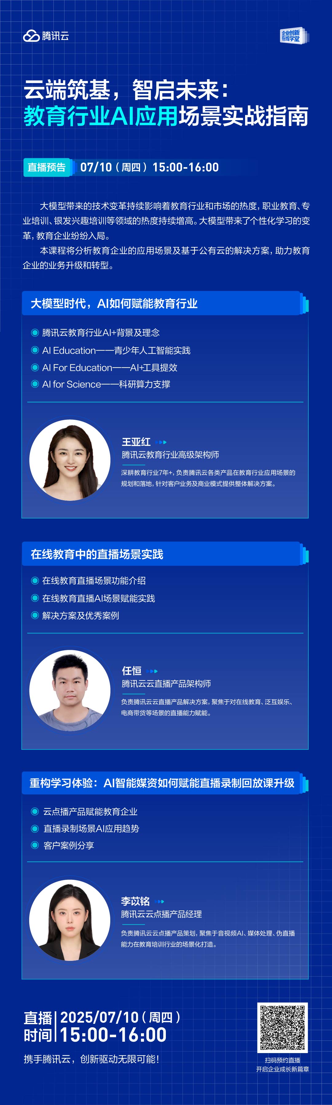 👇 扫码报名观看直播,腾讯云行业专家将揭秘职业教育及专业培训领域的AI化路径,分享编程教育、精准教学、在线直播场景的提效方案,更有头部企业案例解析!