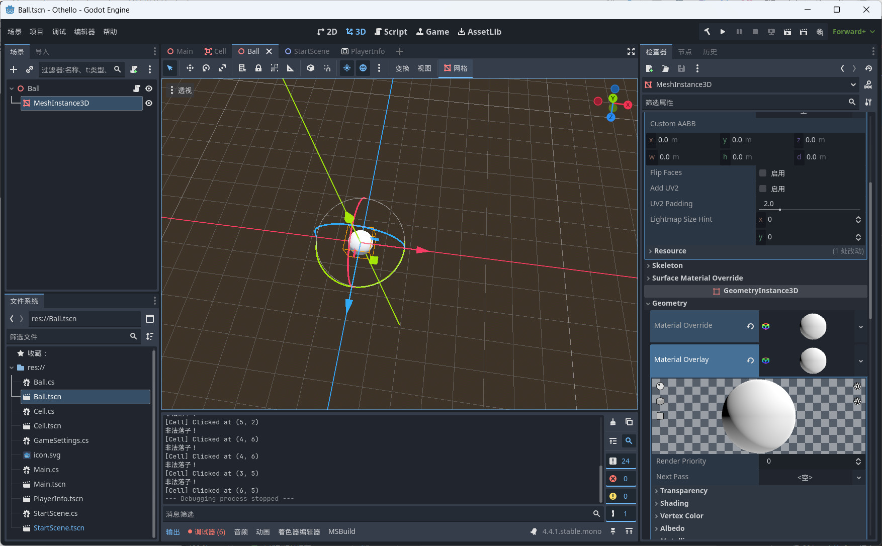 添加一个Ball.tscn,根节点维Node3D,添加子节点MeshInstance3D,Mesh设置为SphereMesh球体形状,Material Override 新建StandardMaterial3D。