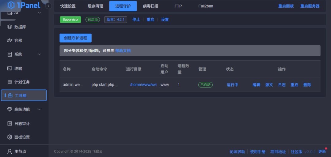 列表页面可以操作守护进程,包括启动、停止、重启、查看日志、编辑、删除、修改源文等