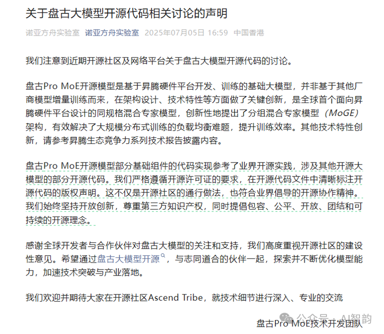 面对汹涌质疑,华为诺亚方舟实验室于7月5日发布正式声明。声明包含三重核心立场:坚决否认增量训练指控,承认参考开源代码,强调创新价值。