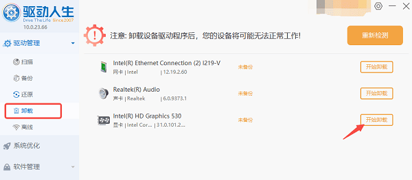 1. 备份完成后,进入“卸载”页面,找到显卡驱动开始卸载。