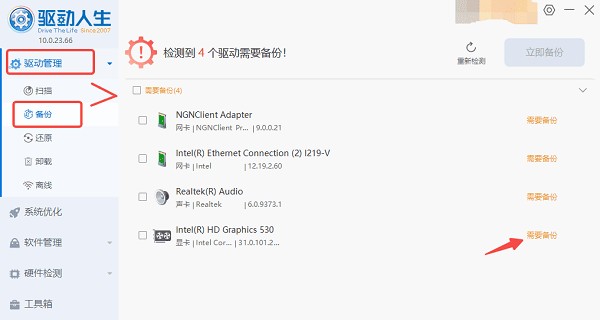 1. 安装并打开“驱动人生”软件,切换到“驱动管理-备份”界面;