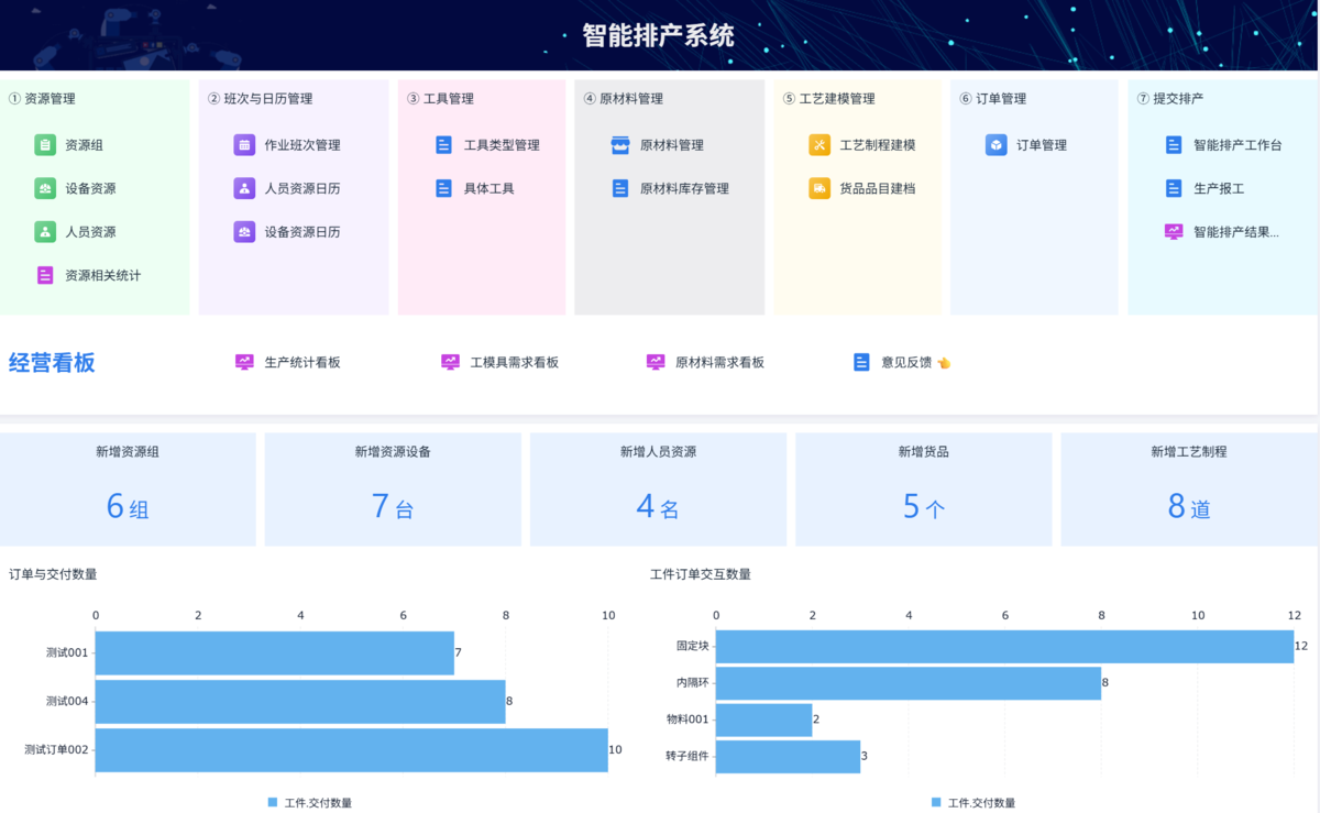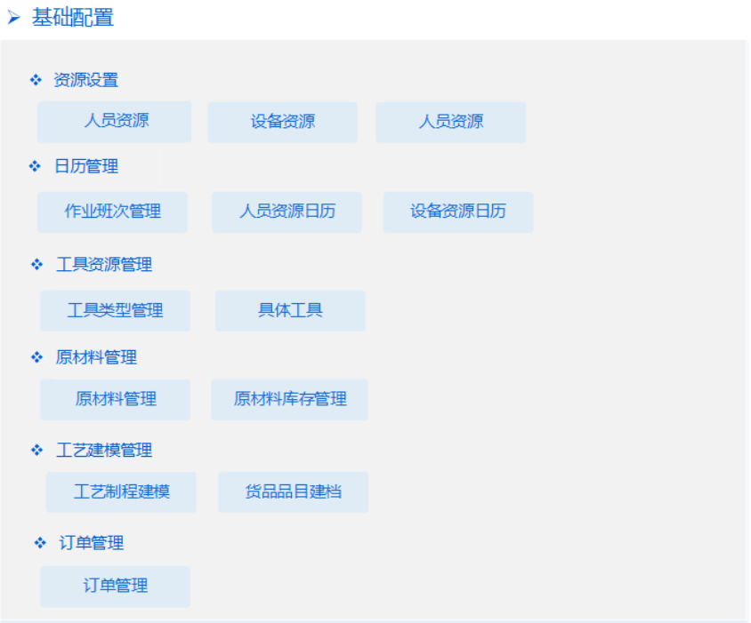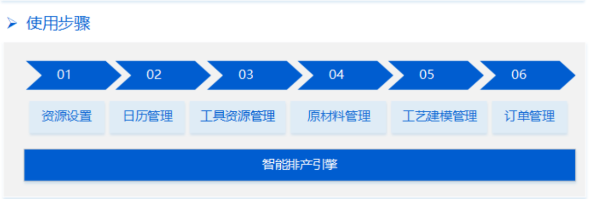 资源设置 → 日历管理 → 工具资源 → 原材料 → 工艺建模 → 订单管理 → 智能排产引擎运行