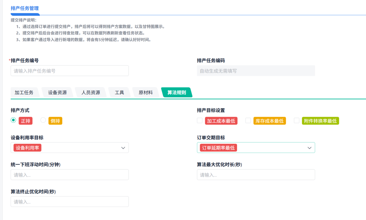 排产系统支持物料齐套校验,原料不到位的任务会被识别为“不可排”。
