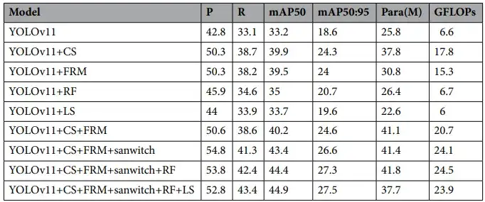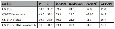 为评估各模块对整体性能的影响,论文设计了逐步引入模块的消融实验,包括CS-FPN、FRM、Sandwich融合、RFAConv和LSDECD检测头。