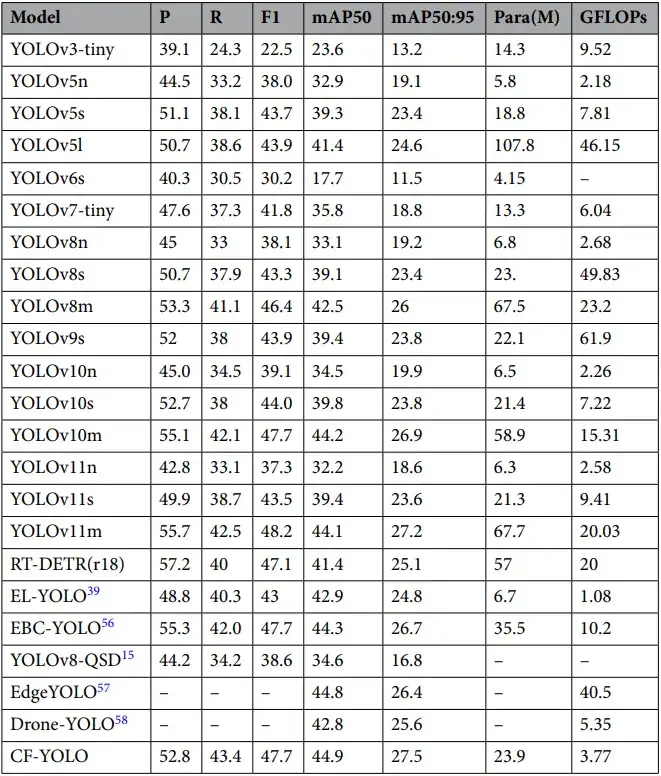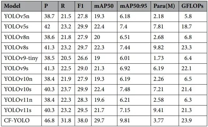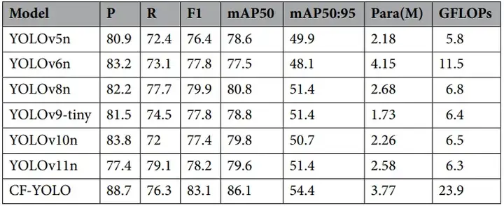 为了验证CF-YOLO的综合性能,作者将其与YOLOv5、YOLOv8、YOLOv10、RT-DETR等多种主流轻量级或中量级检测模型进行了全面对比。
