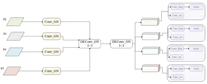传统YOLOv11中,各检测头之间缺乏有效的信息交互,导致多尺度检测精度有限。为了解决这一问题,CF-YOLO设计了LSDECD(Lightweight Spatial-Depth Enhanced Cross-Detection)检测头,在保持轻量化结构的同时,显著提升了特征表示能力。