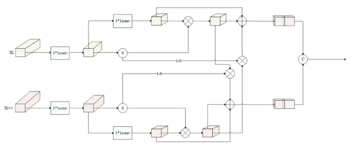 Sandwich模块的核心设计在于通过上采样和下采样得到的不同分支特征,与中间层特征一起进行加权融合。其融合机制采用加权求和的形式,其中各分支的权重是可学习参数,且通过ReLU和Softmax函数保证非负性与归一化。