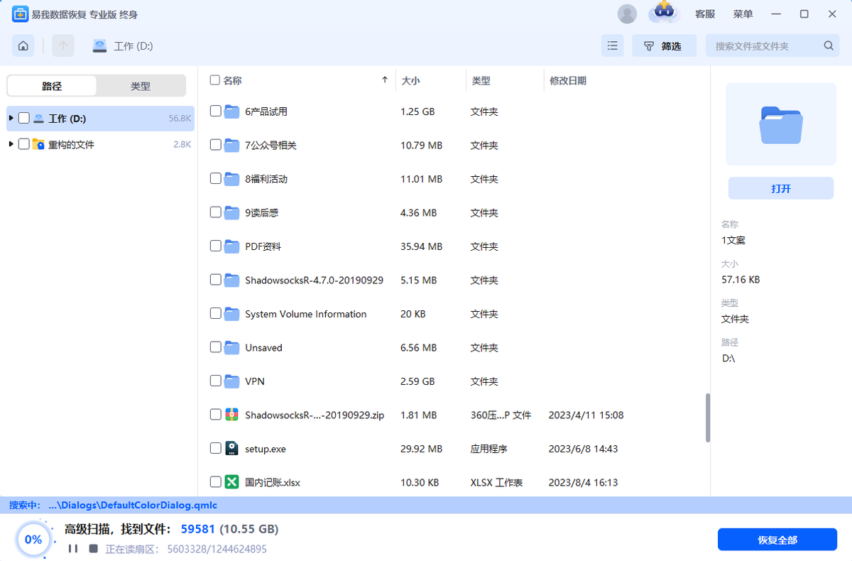 扫描完成后,软件会将扫描到的所有文件以列表形式展示出来。用户可以在左侧的文件分类栏中,按照文件类型(如文档、图片、视频等)或路径(如文件夹结构)对文件进行分类查看。在文件列表中,点击文件即可进行预览。
