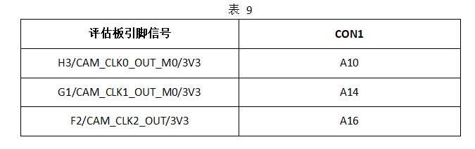 请将评估板R342、R347、R354空贴,然后通过飞线方式,将评估板接口引脚信号H3/CAM_CLK0_OUT_M0/3V3、G1/CAM_CLK1_OUT_M0/3V3、F2/CAM_CLK2_OUT/3V3端口,分别连接至TL7616P模块CON1接口的A10、A14、A16引脚,为TL7616P模块提供控制信号,连接关系如下表。