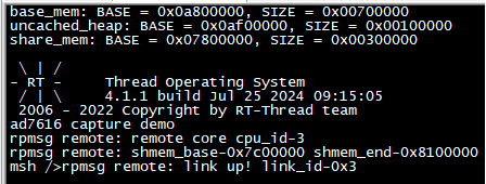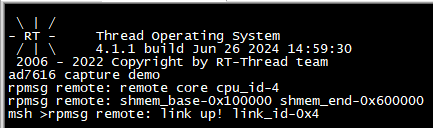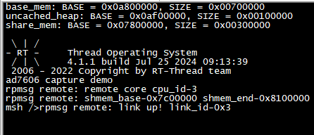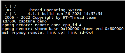 请参考用户手册《基于Linux + RT-Thread、Baremetal的AMP开发案例》文档“工程编译与固化”章节,将案例需运行核心bin目录下的amp_ad7606_capture.img镜像文件固化至评估板,请根据实际情况固化案例测试的内核镜像。