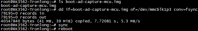 Target# dd if=boot-ad-capture-mcu.img of=/dev/mmcblk1p3 conv=fsync //替换内核镜像