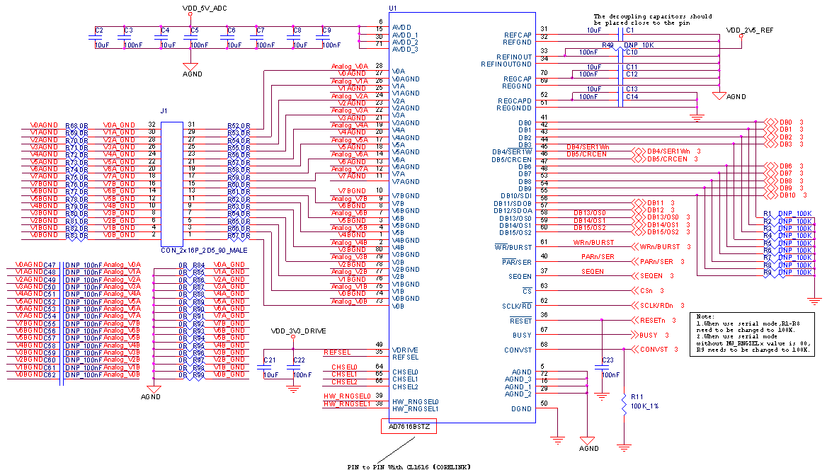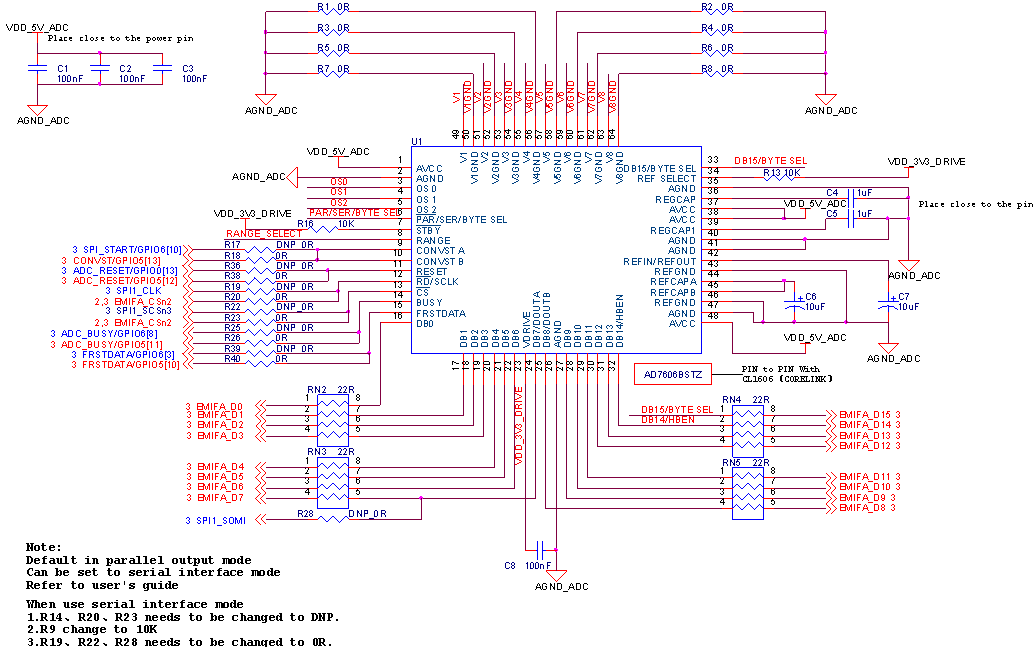 创龙科技TL7606I模块、TL7616P模块可支持串行模式和并行模式,且硬件设计默认为并行模式,请根据AD模块原理图说明将AD模块修改为串行模式再进行测试。