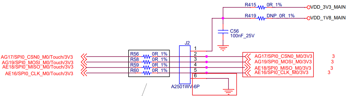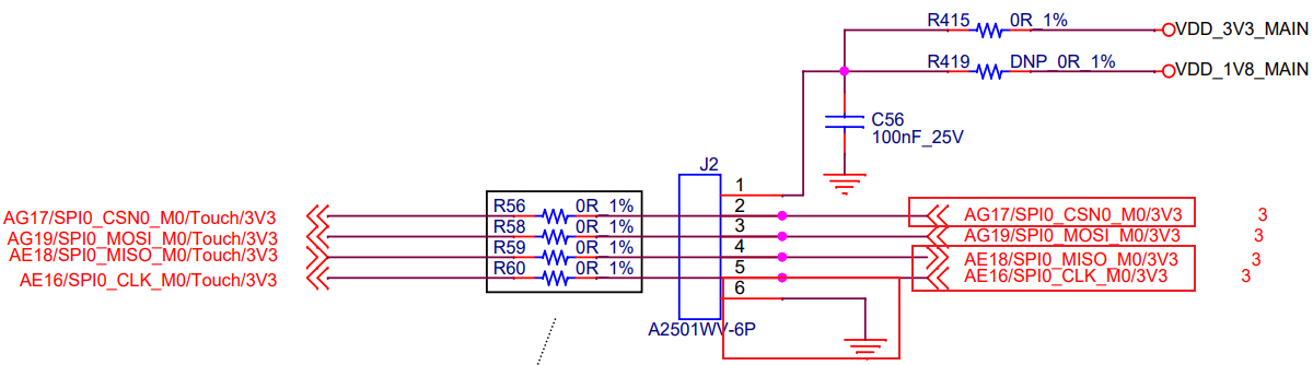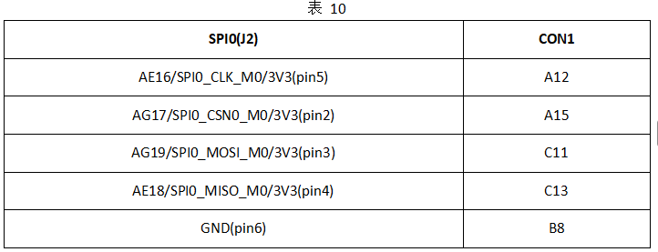 将评估板R56、R58、R59、R60空贴,然后通过飞线方式将SPI0接口(J2)上AE16/SPI0_CLK_M0/3V3(pin5)、AG17/SPI0_CSN0_M0/3V3(pin2)、AG19/SPI0_MOSI_M0/3V3(pin3)、AE18/SPI0_MISO_M0/3V3(pin4)、GND(pin6),连接至TL7616P模块CON1接口的A12、A15、C11、C13、B8引脚,为TL7616P模块提供SPI信号,连接关系如下表。