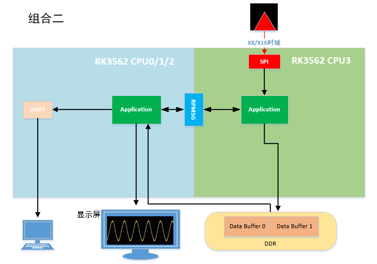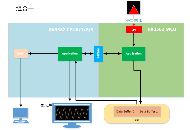 案例使用SPI总线采集8/16通道AD数据,评估板Cortex-A53(CPU0、CPU1、CPU2、CPU3)核心运行Linux系统,Cortex-M0(MCU)核心运行Baremetal(即m0_baremetal)、RT-Thread(即m0_rtos)程序。Baremetal/RT-Thread(RTOS)端通过SPI采集的AD数据写入DDR共享内存,并通过rpmsg发送写入的共享内存信息至Linux应用程序,Linux端应用程序通过rpmsg接收Baremetal/RT-Thread(RTOS)端发送的共享内存信息后,从指定共享内存中读取AD数据,并将数据转换得到电压值,然后通过Qt显示波形至显示屏。