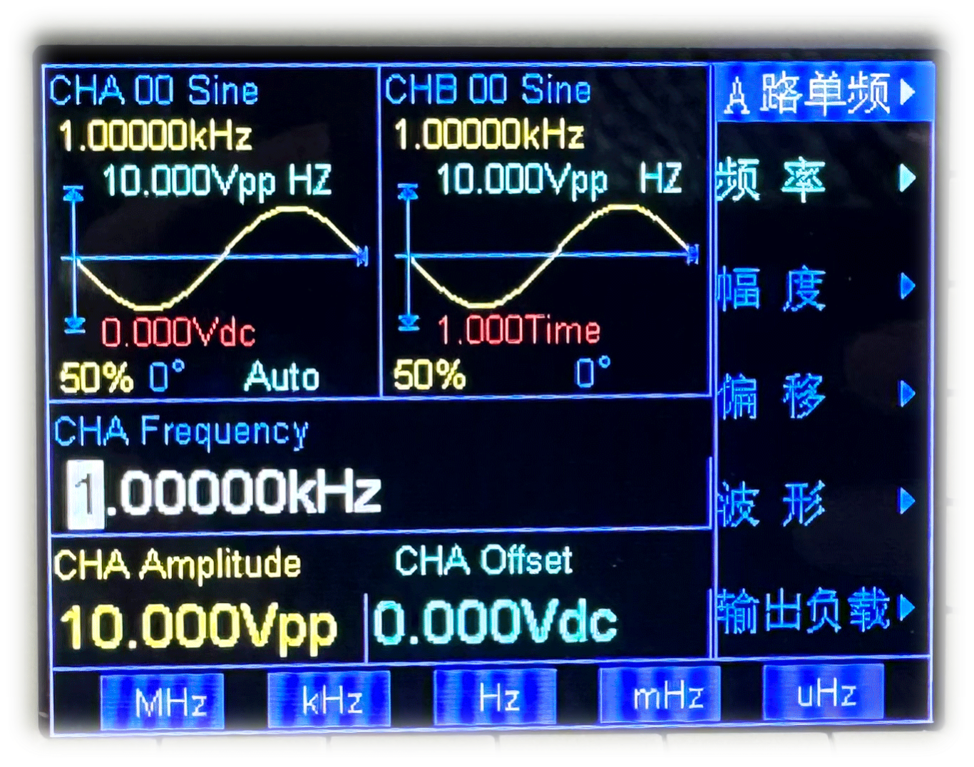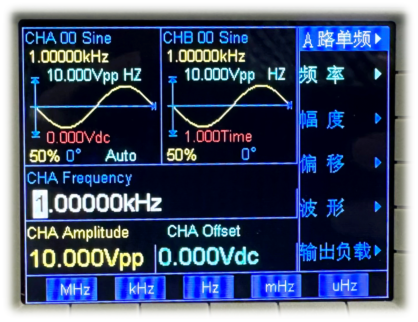 案例支持TL7616P模块16通道AD数据同时采集与显示。本次测试以TL7616P模块V7B和V0A通道为例,请将TL7616P模块的V7B和V0A通道分别正确连接至信号发生器A通道和B通道。信号发生器设置A通道输出频率为1KHz、峰峰值为10.0Vpp(即幅值为5.0V)的正弦波信号,B通道输出频率为1KHz、峰峰值为10.0Vpp(即幅值为5.0V)的正弦波信号,如下图所示。待测信号电压请勿超过模块量程,否则可能会导致模块损坏。