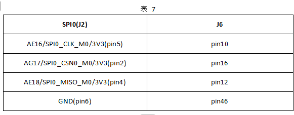 将评估板R56、R58、R59、R60空贴,然后通过飞线方式将SPI0接口(J2)上AE16/SPI0_CLK_M0/3V3(pin5)、AG17/SPI0_CSN0_M0/3V3(pin2)、AE18/SPI0_MISO_M0/3V3(pin4)、GND(pin6)、连接至TL7606I模块J6接口的pin10、pin16、pin12、pin46引脚,为TL7606I模块提供SPI信号,连接关系如下表。