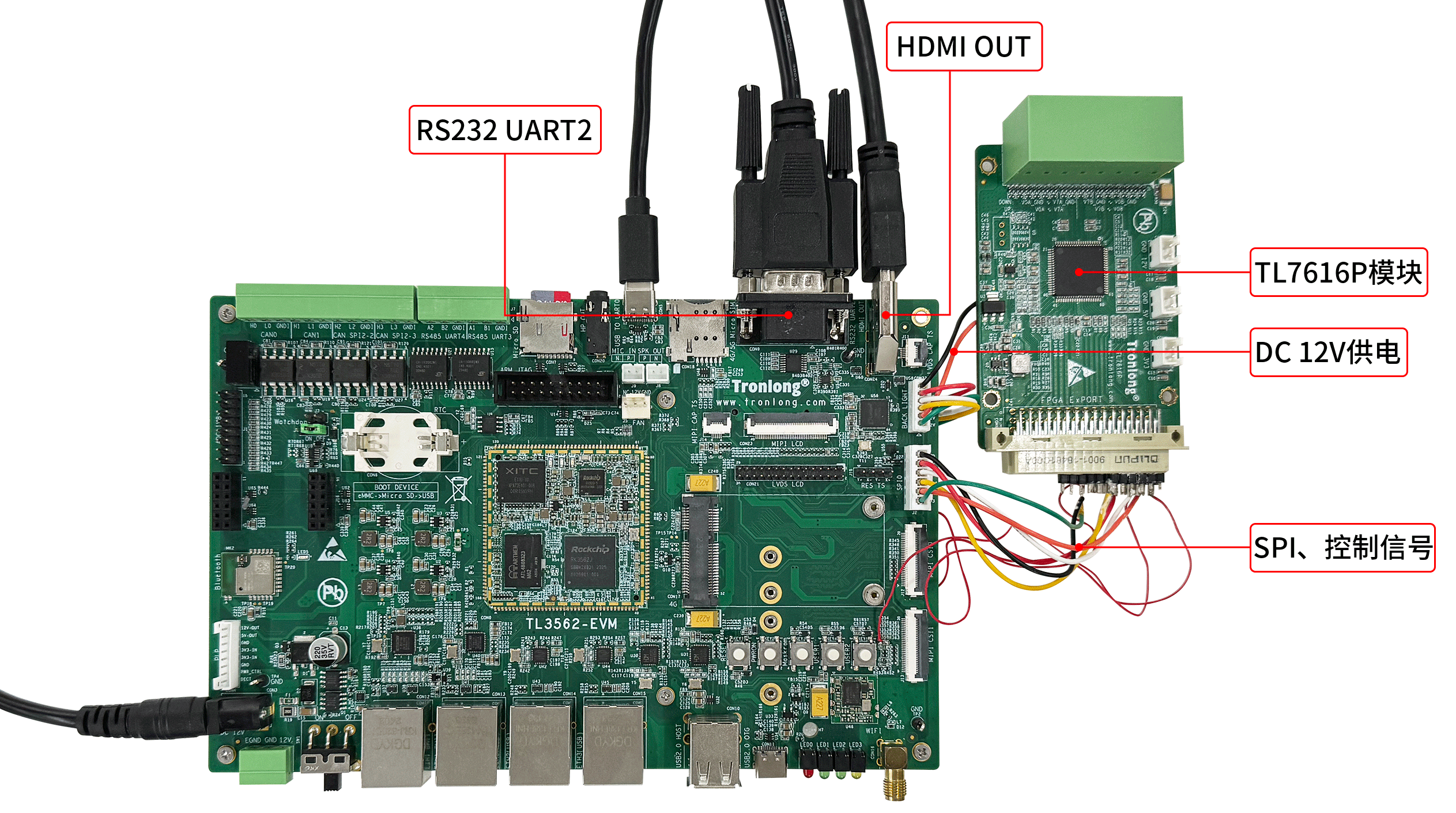 请使用RS232交叉串口母母线、USB转RS232公头串口线将评估板RS232 UART2串口连接至PC机,使用HDMI线将评估板HDMI OUT接口与HDMI显示屏连接。
