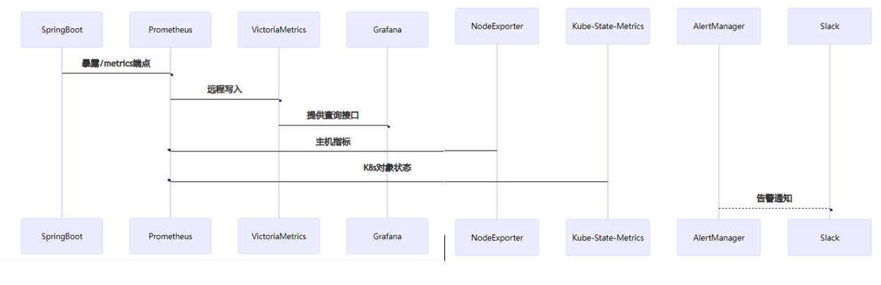 图3:监控数据时序交互 描述从数据采集到可视化的完整生命周期:应用通过Micrometer暴露指标,Prometheus定时拉取并远程写入VictoriaMetrics长期存储,Grafana执行聚合查询。箭头方向体现数据流向与组件依赖关系。