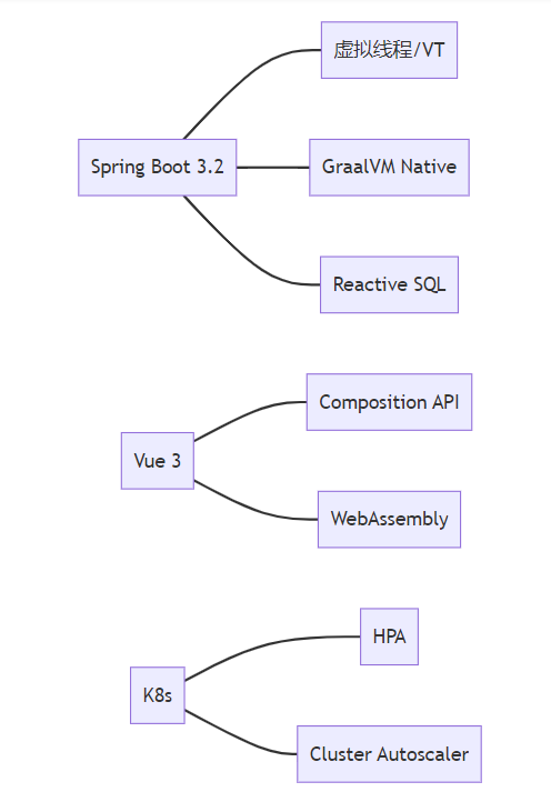 图1:技术栈能力拓扑图 展示各技术组件如何协同解决高并发场景下的核心问题:Spring Boot 3.2的虚拟线程解决阻塞IO问题,Vue 3的组合式API优化前端渲染性能,Kubernetes的弹性扩缩容保障资源利用率。箭头方向表示技术能力支撑关系。