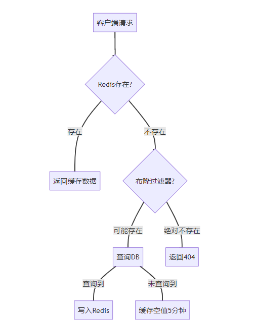图4:缓存穿透防护流程图 描述请求处理逻辑:优先检查Redis缓存,未命中时通过布隆过滤器拦截无效请求,穿透到数据库的请求结果无论是否存在都回填缓存。菱形决策点体现关键判断逻辑,有效降低数据库压力。