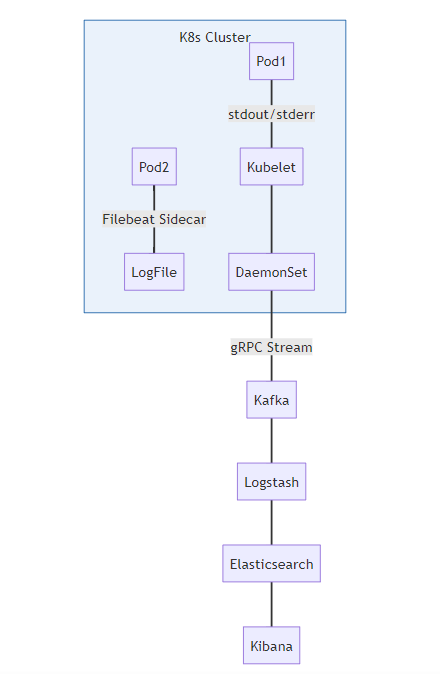 图2:日志收集数据流 展示Kubernetes环境中多源日志采集路径:标准输出由DaemonSet收集,应用日志通过Sidecar模式的Filebeat捕获,经Kafka缓冲后由Logstash进行ETL处理,最终持久化到Elasticsearch。gRPC流式传输降低网络开销。