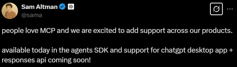 OpenAI CEO Sam Altman 在 X(原Twitter)上发文力挺:“MCP的市场反响很好,我们也很高兴能在自家产品中支持这项协议。目前此协议已经在 Agents SDK 中开放,对于 ChatGPT 桌面版应用以及 Responses API 的支持也即将推出!”