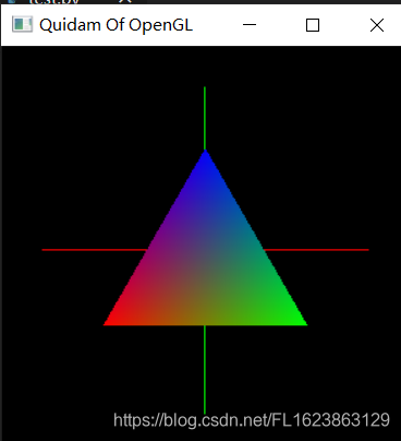 def draw(): # --------------------------------------------------------------- glBegin(GL_LINES) # 开始绘制线段(世界坐标系) # 以红色绘制x轴 glColor4f(1.0, 0.0, 0.0, 1.0) # 设置当前颜色为红色不透明 glVertex3f(-0.8, 0.0, 0.0) # 设置x轴顶点(x轴负方向) glVertex3f(0.8, 0.0, 0.0) # 设置x轴顶点(x轴正方向) # 以绿色绘制y轴 glColor4f(0.0, 1.0, 0.0, 1.0) # 设置当前颜色为绿色不透明 glVertex3f(0.0, -0.8, 0.0) # 设置y轴顶点(y轴负方向) glVertex3f(0.0, 0.8, 0.0) # 设置y轴顶点(y轴正方向) # 以蓝色绘制z轴 glColor4f(0.0, 0.0, 1.0, 1.0) # 设置当前颜色为蓝色不透明 glVertex3f(0.0, 0.0, -0.8) # 设置z轴顶点(z轴负方向) glVertex3f(0.0, 0.0, 0.8) # 设置z轴顶点(z轴正方向) glEnd() # 结束绘制线段 # --------------------------------------------------------------- glBegin(GL_TRIANGLES) # 开始绘制三角形(z轴负半区) glColor4f(1.0, 0.0, 0.0, 1.0) # 设置当前颜色为红色不透明 glVertex3f(-0.5, -0.366, -0.5) # 设置三角形顶点 glColor4f(0.0, 1.0, 0.0, 1.0) # 设置当前颜色为绿色不透明 glVertex3f(0.5, -0.366, -0.5) # 设置三角形顶点 glColor4f(0.0, 0.0, 1.0, 1.0) # 设置当前颜色为蓝色不透明 glVertex3f(0.0, 0.5, -0.5) # 设置三角形顶点 glEnd() # 结束绘制三角形 # --------------------------------------------------------------- glFlush() # 清空缓冲区,将指令送往硬件立即执行