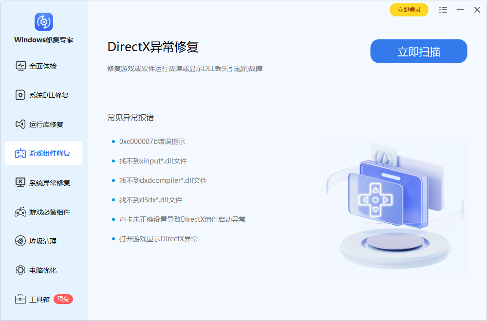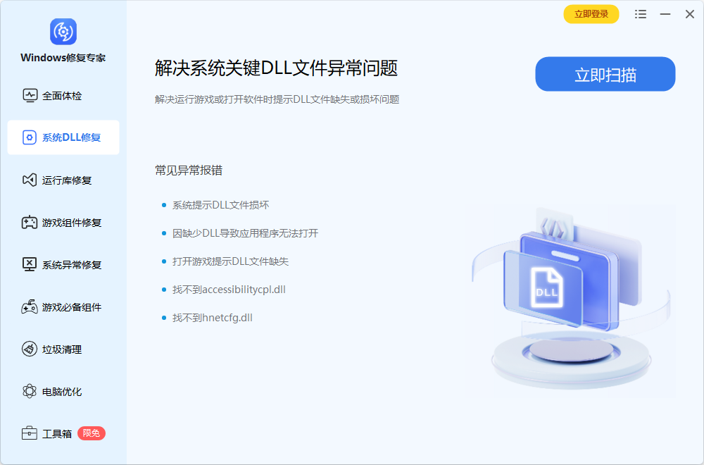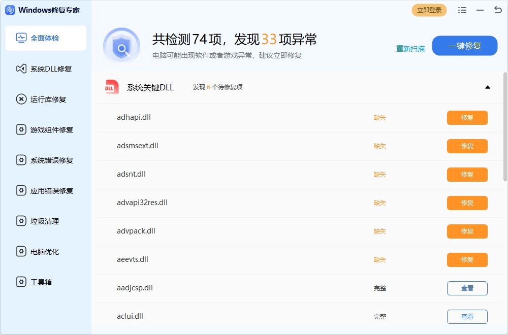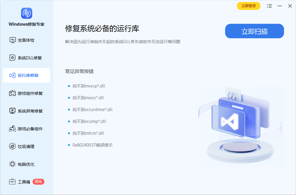 一键修复任何因dll缺失、版本错误导致的游戏、软件不能运行的系统问题 MSVCP、DLL修复vcruntime、DLL修复、.Net Framework缺失、DirectX类DLL修复、VC运行库修复