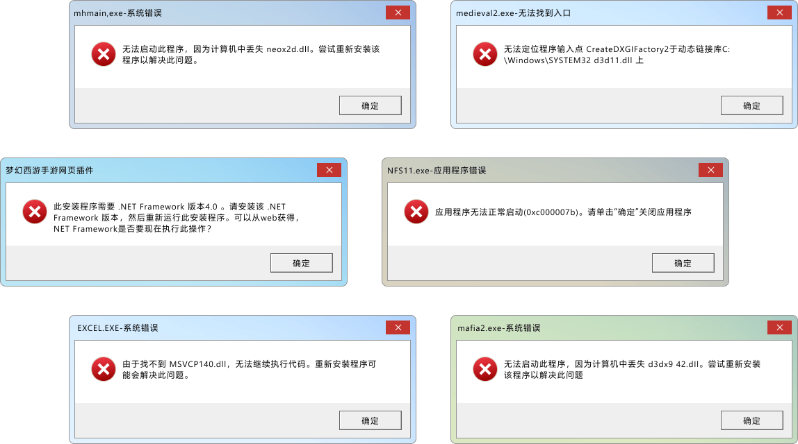neox2d.dll。尝试重新安装该程序以解决此问题。CreateDXGIFactory2于动态链接库C:\Windows\SYSTEM32\d3d11.dll 上.NET Framework 版本4.0 。请安装该 .NET Framework 版本,然后重新运行此安装程序。可以从web获得,NET Framework是否要现在执行此操作?0xc000007b)。请单击“确定”关闭应用程序d3dx9 42.dll。尝试重新安装该程序以解决此问题。自动检测全部DLL缺失问题