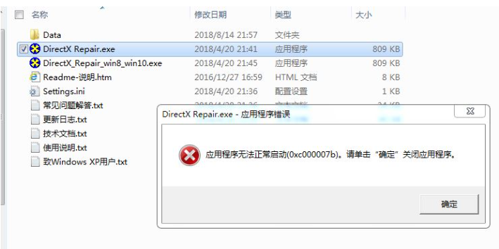 导致0xc000007b问题众多,一般情况下都可以通过使用DirectX修复工具增强版修复解决。可是如果连DirectX修复工具自己都出现0xc000007b错误,则极有可能是病毒修改了文件导致,可通过全盘杀毒,或换用其他杀毒软件全盘杀毒解决。判断是否为病毒作祟的方法是看DirectX修复工具exe文件的大小或者校验码是否和本文表格中的一致,不一致就是病毒修改导致(校验工具链接)。