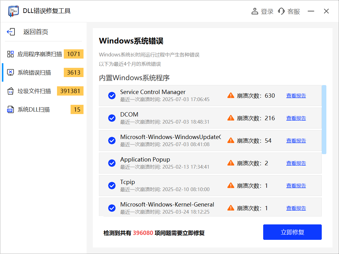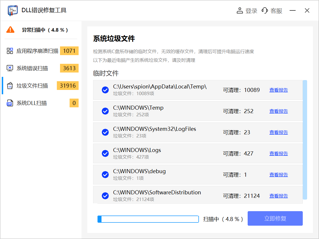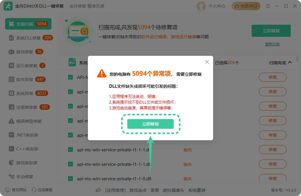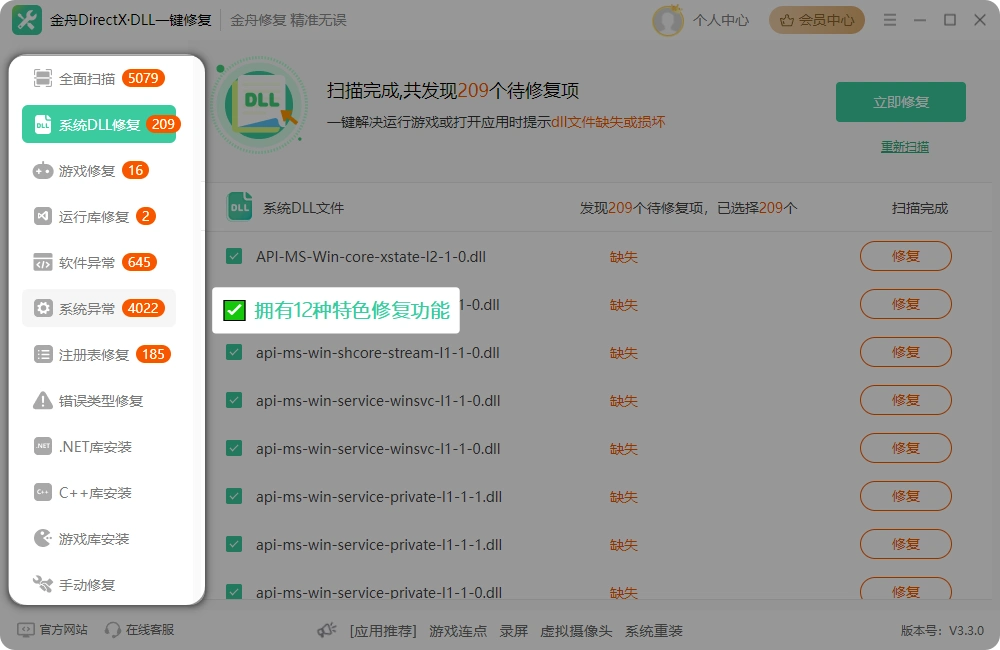 智能检测Windows系统DLL、运行库、DirectX等DLL丢失等异常状态,对出现问题的dll文件等能进行一健修复,没必要再去网上找相关的DLL文件。