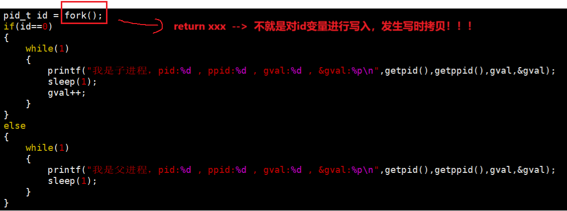 printf("我是父进程,pid:%d , ppid:%d , gval:%d , &gval:%p\n",getpid(),getppid(),gval,&gval);