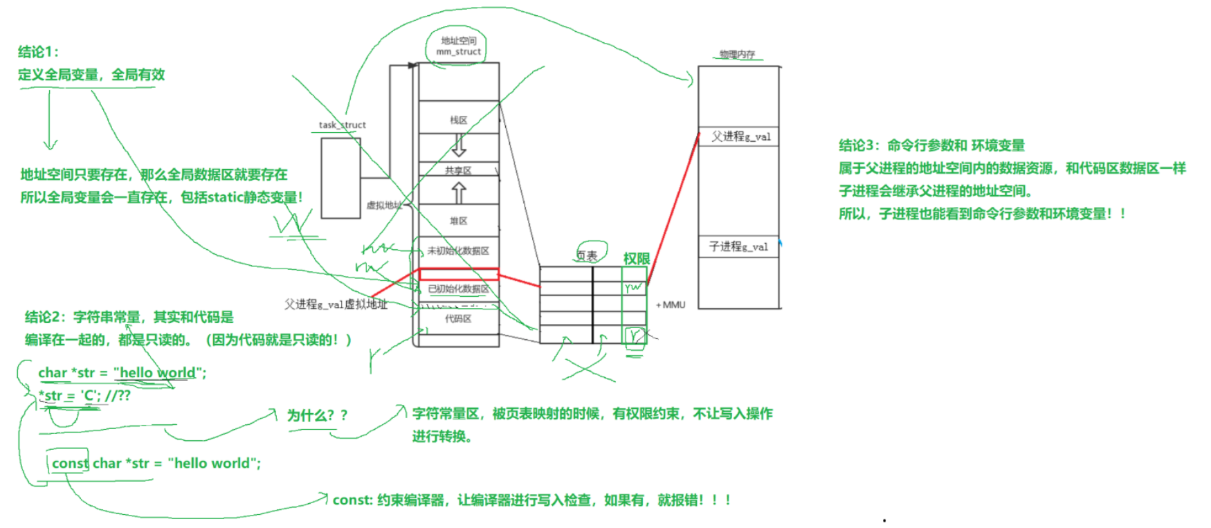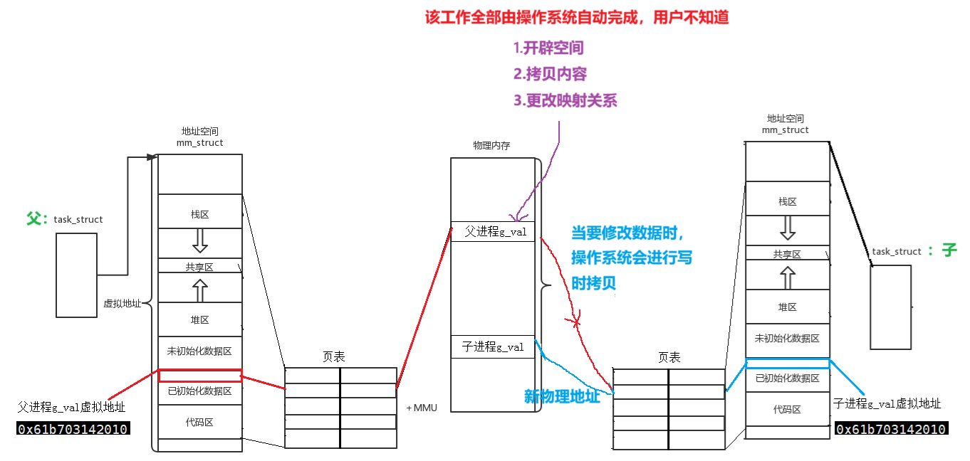 父进程创建子进程,子进程会以父进程的代码和数据为副本进行创建,此时都指向父进程的物理内存的g_val值。而当对g_val的值做修改时,操作系统会对g_val值做写时拷贝,即在物理内存开辟一段新的空间,将g_val的值拷贝到新空间上,并更改映射关系,从而使同一份虚拟地址可以出现两个值,因为它们映射到的物理内存的位置是不一样的!!!