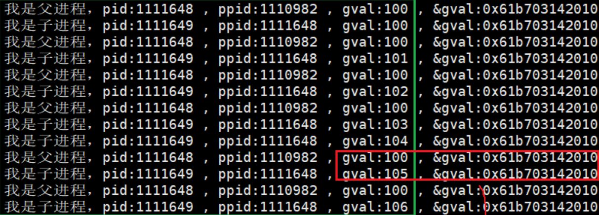 }在上面这段程序中,父进程fork一个子进程。接着父子进程分别进入自己的执行流。子进程的执行流是每次打印都会将gval进行++,同时打印gval的地址;父进程也同样打印gval值和它的地址,但是不对gval进行++。