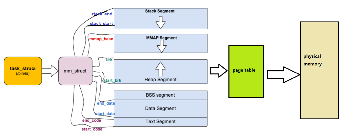 vm_area_struct :描述单个内存区域的具体细节,每个 vm_area_struct 描述进程地址空间中 一段连续的内存区域。