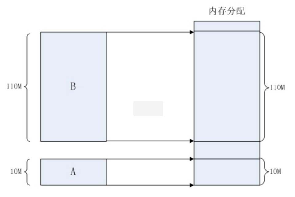 那当程序同时运⾏多个程序时,操作系统是如何为这些程序分配内存的呢?例如某台计算机总的内存⼤⼩是128M,现在同时运⾏两个程序A和B,A需占⽤内存10M,B需占⽤内存110。计算机在给程序分配内存时会采取这样的⽅法:先将内存中的前10M分配给程序A,接着再从内存中剩余的118M中划分出110M分配给程序B。