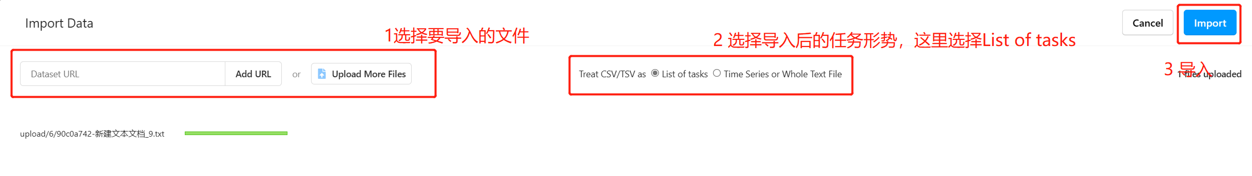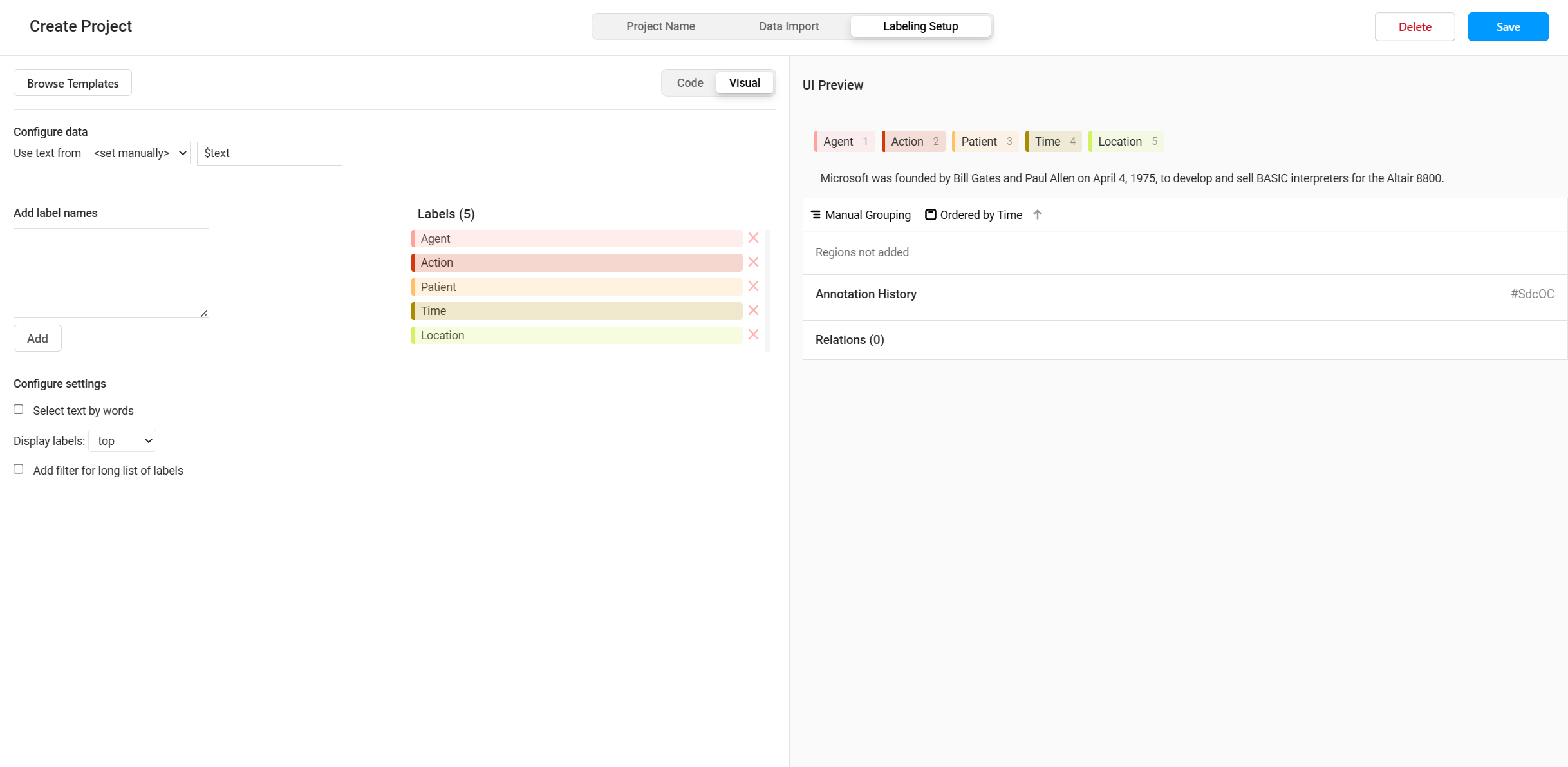 上述设置也可以在直接创建项目后的Settings中进行设置 projects / 测试项目 / Settings General:设置项目名称和简述 Labeling Interface: Browse Templates:选择模板 Add label names:添加标签 Labels:设置标签颜色,删除标签 可以在项目中的Import导入新的需要标注的数据文件
