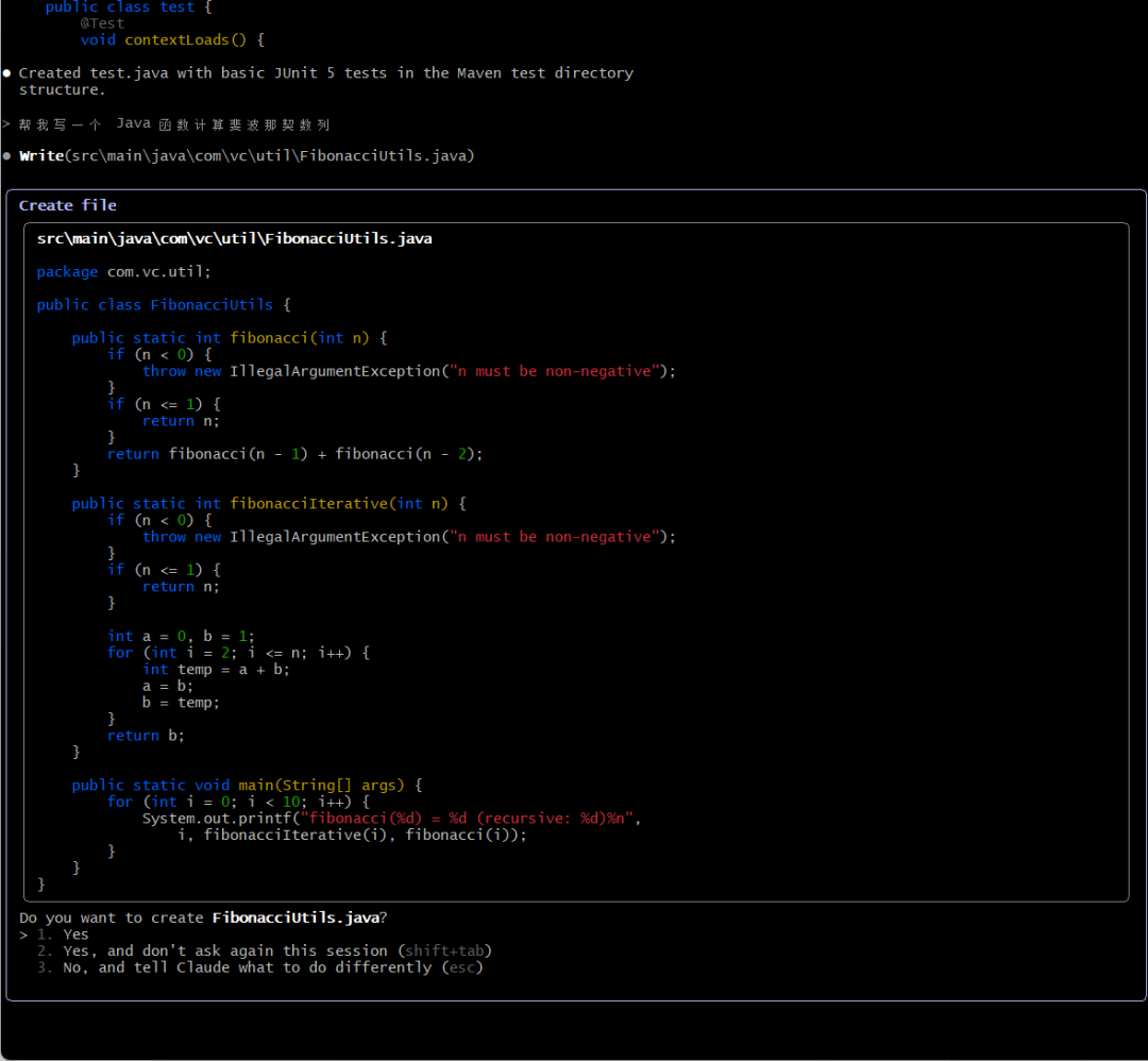 Claude Code 的交互体验很不错,你可以直接用自然语言描述需求,它会帮你生成代码、解释代码逻辑、修复 bug 等。比如你可以说"帮我写一个 Java 函数计算斐波那契数列",它就会生成相应的代码并解释实现思路。