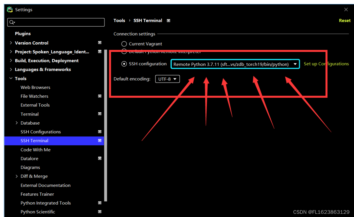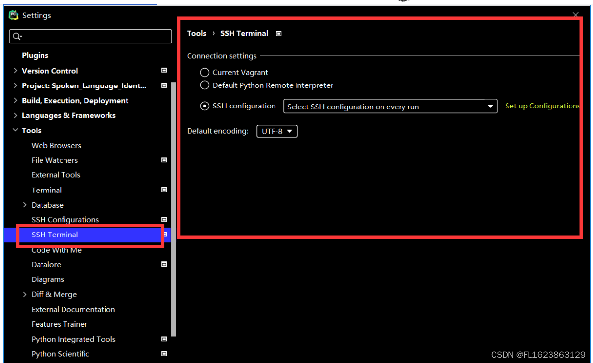 想要默认终端连接远程服务器,需要点File->Setting->Tools->SSH Terminal 或者直接搜Terminal,找到这个界面