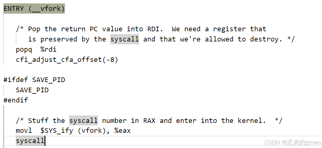 通过观察,我们也可以发现在glibc的封装实现,是先将系统调用号写入寄存器eax;然后再syscall触发软中断,让CPU根据eax寄存器中的系统调用号执行对应的方法。